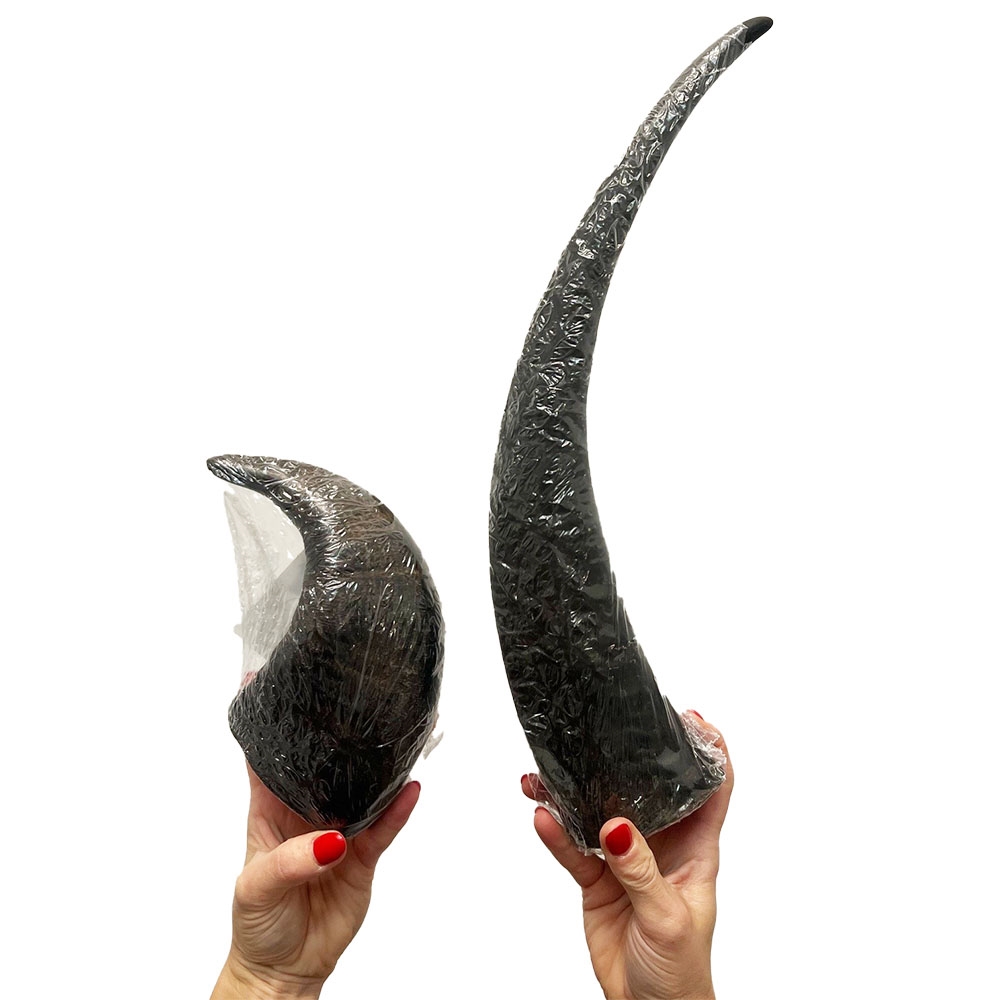 De er aldrig ens, da bøfler er forskellige. Så du kan komme ud for at få et meget langt og mere lige horn, eller et mindre krøllet horn. Se eksempel på vores billede.