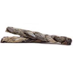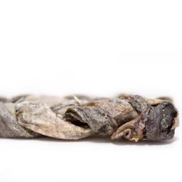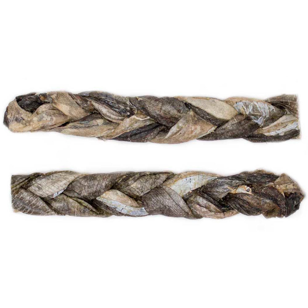 Tørrede torskeskind flettet til to lækre fletninger. En naturlig snack til hunden