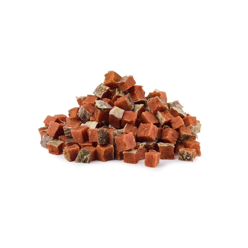 Sunde og fedtfattige tern af laks. Lufttørres og virkelig lækre guffer til din hund! Pose med 80 gram