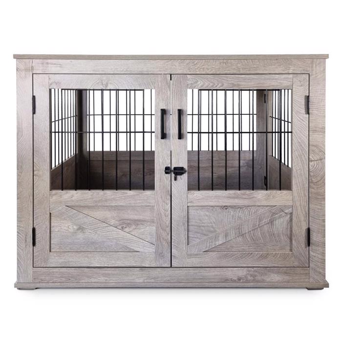 Rustikt og luksuriøst hundebur til hjemmet. Smuk gråmateret farve.