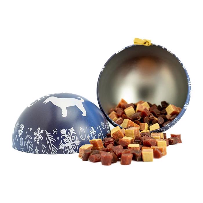 Sød julekugle til hundens jul. Indeholder godbidder med kylling, and og torsk.
