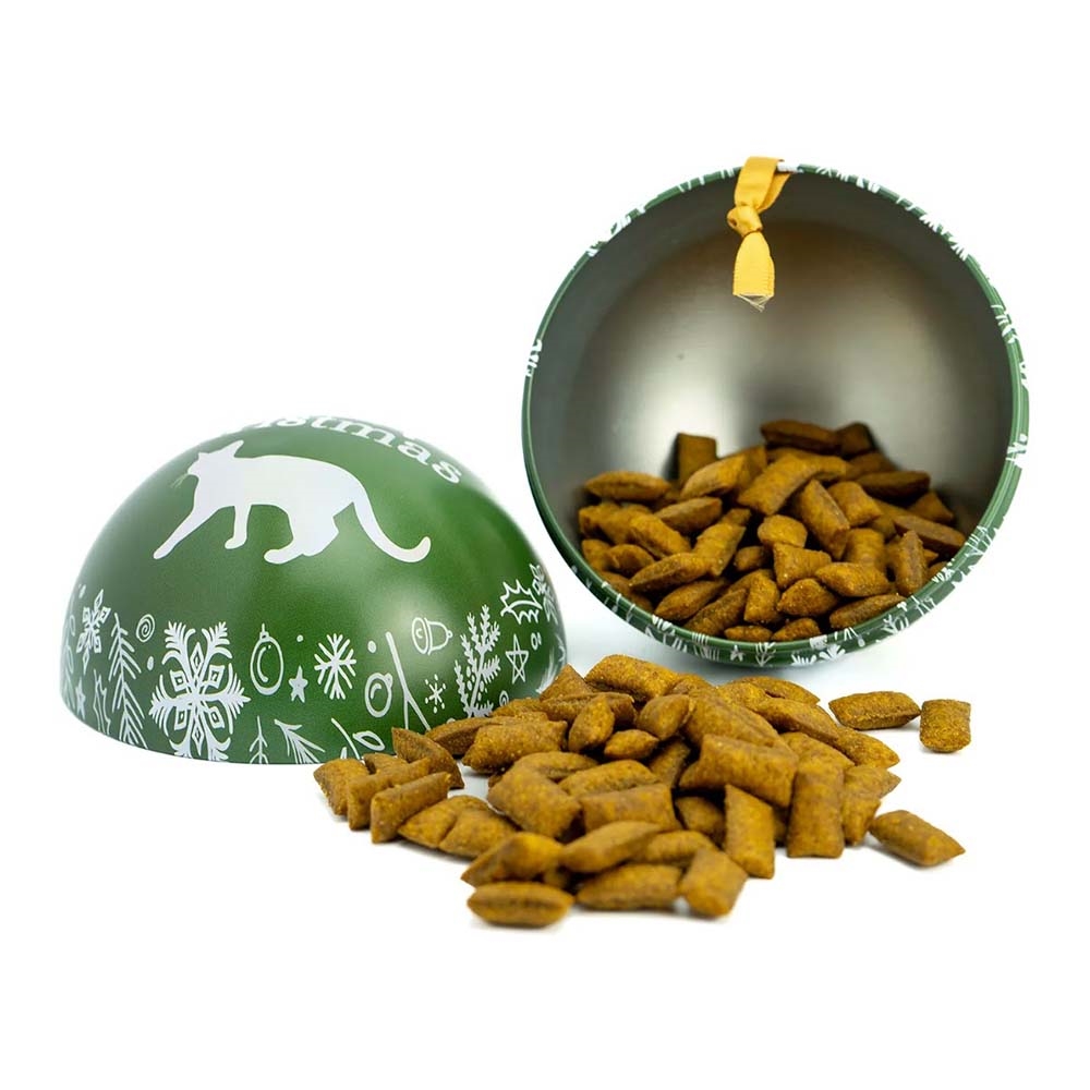 Din kat skal da også mærke at det er jul. Denne søde julekugle med en kattemis på, kan du hænge op som pynt på træet. Kuglen er fuld af lækre godter til katten.