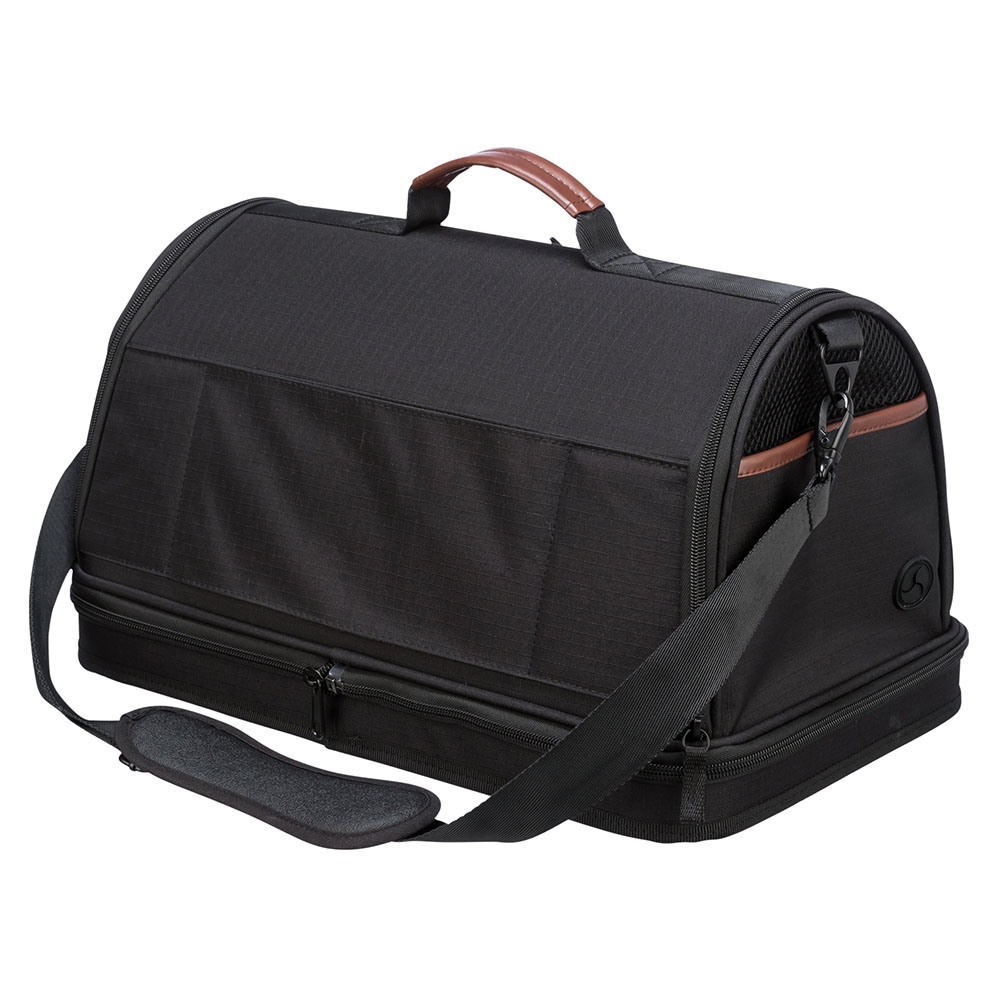 Tasken kan åbnes i siden, foroven og foran. Den har en udvendig lomme og en aftagelig skulderrem. Indvendigt i tasken er der en kort snor, så du kan sætte din hund fast i dens sele.