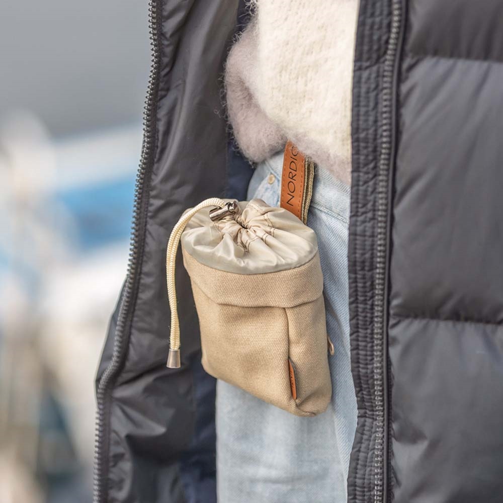 Denne sandfarvede godbidslomme er designet så den kan lukkes med en snøre. Tasken har en integreret hundelorteposedispenser.