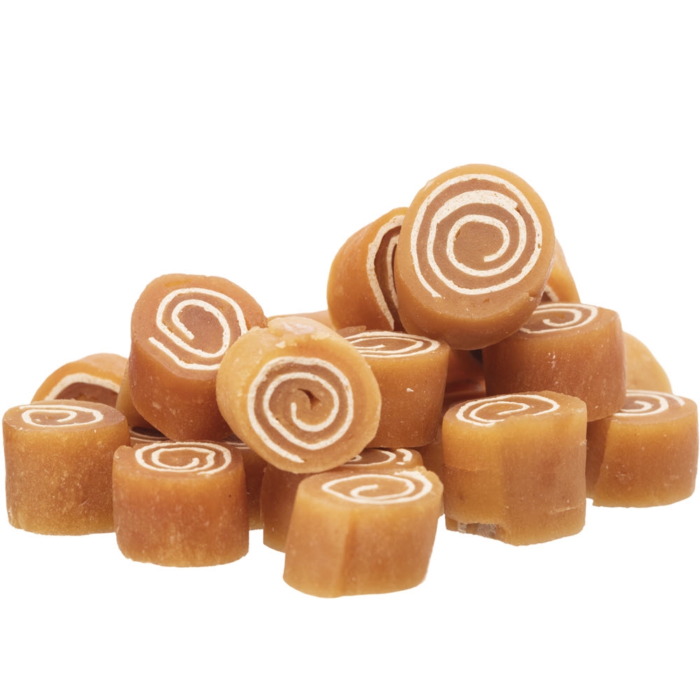 Lækre små ruller af kylling og fisk. Kan gives til alle slags hunde. Der er 75 gram i posen. Premio