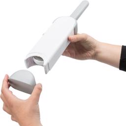 Fnugbørsten her er hvid og grå. Den kan bruges til polstrede møbler og tekstiler. Børsten har et fløjlsbetræk, som gør at håret klæber fast på børsten.