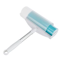 Fnugrullen her er hvid og turkis. Den kan bruges til polstrede møbler og tekstiler. Rullen består af silikone, som har den effekt at kunne rulle støv og dyrehår til sig. Efter brug vaskes den ren og puttes tilbage i sin beskyttelsesafskærmning.