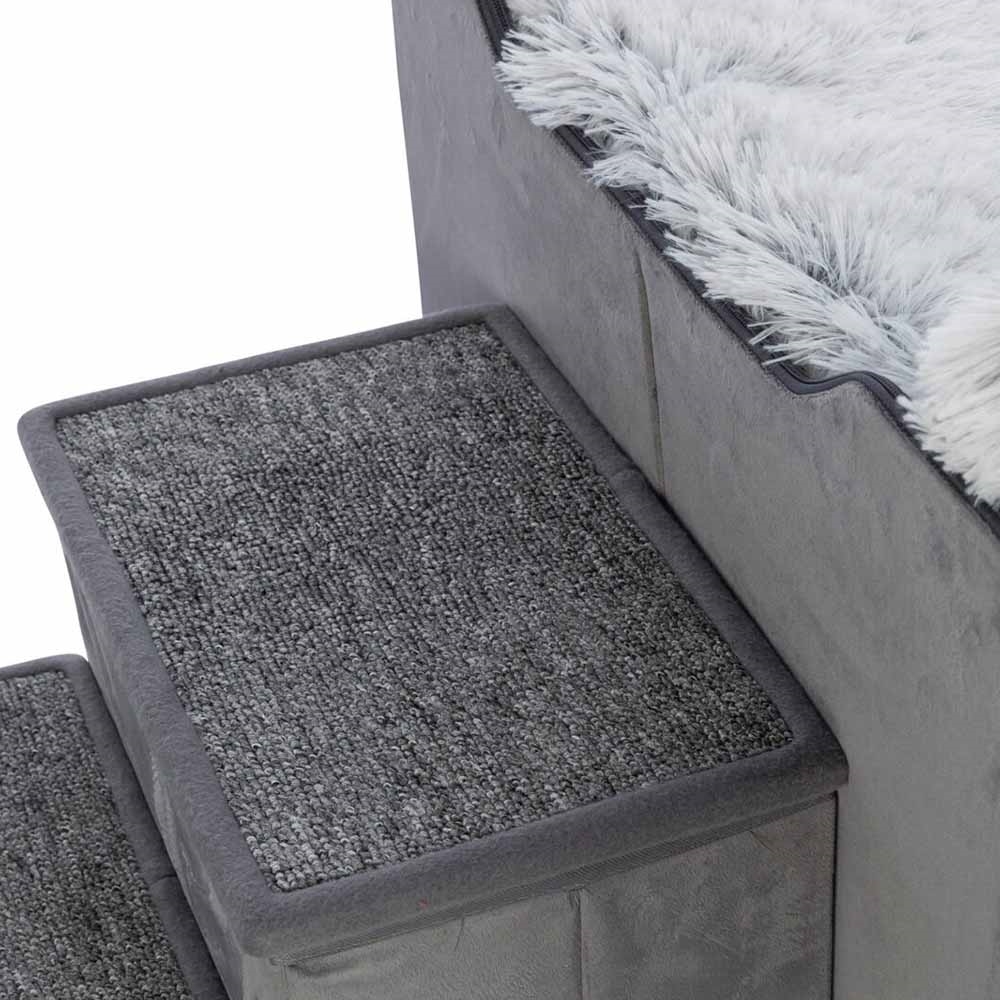 Skal du lave din bedste vens nye yndlings sove- og hyggested, så er her alt hvad du har behov for. Nederst er der en hyggelig hule med en udtagelig vendbar pude. På siden af hulen kan du med velcro fastgøre en 3-trins trappe, der giver adgang til sengen på taget. Den øverste soveplads kan tages af. Denne måler 90 x 60 cm i ydre mål.