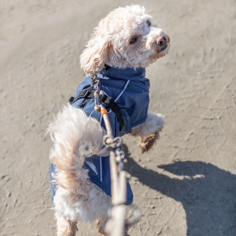 Enkel og fin regnfrakke til hunden i en smuk blå farve. Jakken er designet med reflekterende elementer, for bedre synlighed i de mørklagte timer. Jakken har en vandtæt lynlås, så du kan åbne og fastgøre din hundesnor til hundens sele.