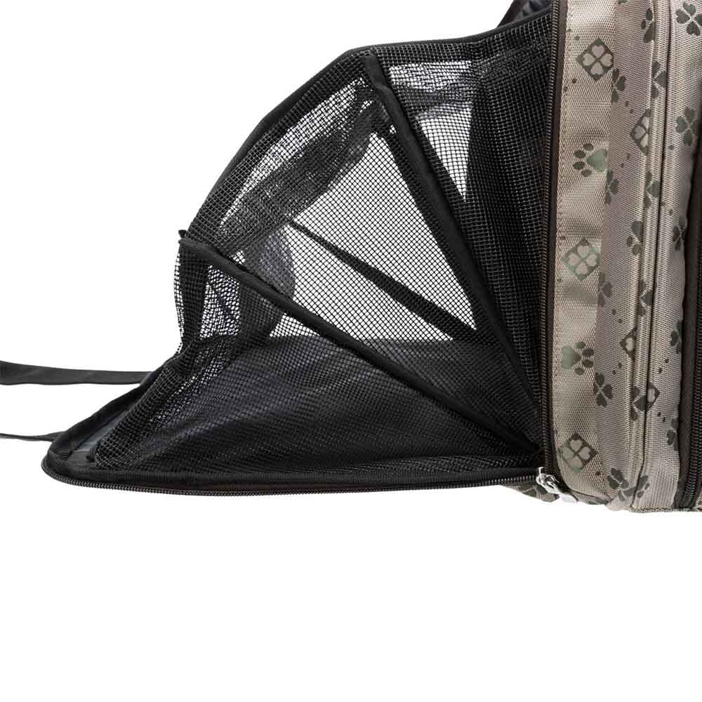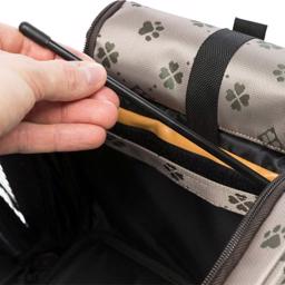 Ligge området kan udvides til dobbelt størrelse, ved at folde sidelommen ned. Det kan man bruge når man er et sted og tasken står sikkert. På den måde får din hund ekstra plads i tasken.