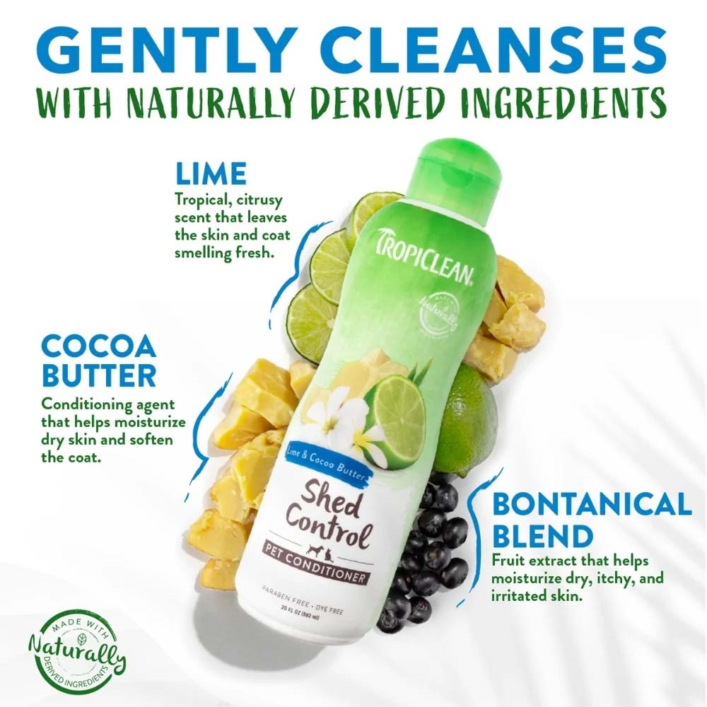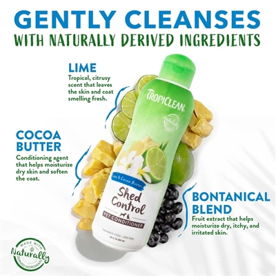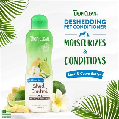 • Reducerer fældning: TropiClean Lime & Cocoa Butter Shed Control Conditioner fugter og plejer hud og pels hos kæledyr for at reducere fældelse.