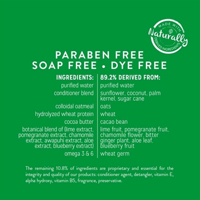 Ingredienser: Vand, balsamblanding, kolloid havregryn, hydrolyseret hvedeprotein, kakaosmør, botanisk blanding af (limeekstrakt, granatæbleekstrakt, kamilleekstrakt, awapuhi-ekstrakt, aloe vera-ekstrakt, blåbærekstrakt), omega 3 og 6, balsammiddel, udredningsmiddel, E-vitamin, alfahydroxy, B5-vitamin, duftstof, konserveringsmiddel.