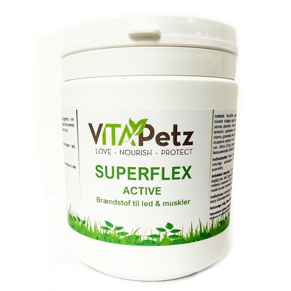 Superflex Active indeholder vigtige byggesten, i en avanceret og potent formel, der bidrager til en normal led- og muskelfunktionen hos den aktive hund. Fodertilskuddet er også velegnet til hunde med særlige udfordringer.