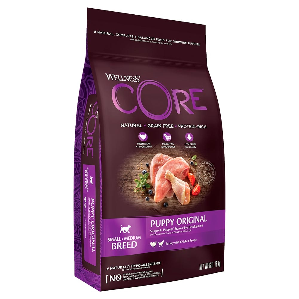 Hvalpe vokser og har brug for afbalancerede niveauer af protein, fedt og kulhydrater for dens energi og vækst. Wellness CORE Puppy indeholder 73 % protein bestående af blandt andet velsmagende ægte kylling, som den første ingrediens til naturligt at understøtte sund energi og slanke muskler. Foderet indeholder blandt andet også kalkun, ærter, tørrede kartofler, lakseolie, gulerødder, æbler og mange andre sunde ting.