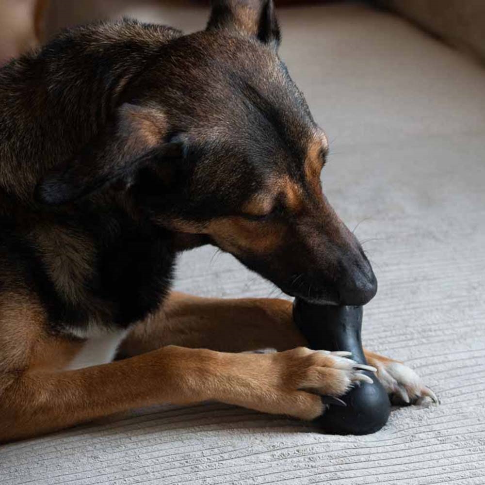 Legetøjet er fremstillet i blødt, men slidstærkt naturgummi og har indvendige rum, der kan fyldes med både godbidder og smørbare snacks. Fyldet kan fryses i legetøjet for ekstra variation og længere, mere udfordrende leg - ideelt på varme dage.