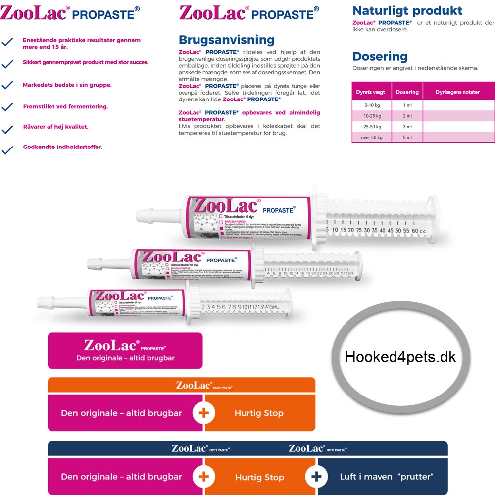 ZooLac Propaste er en bakteriel pasta der medvirker til regulering af bakteriefloraen i mave- og tarmkanalen hos alle dyrearter. Pastaen kan bruges ved akut mavekneb eller til forebyggelse af mave- og tarmforstyrrelser, der kan opstå ved f.eks. foderskift eller stressende omstændigheder. Pastaen leveres i en sprøjte, der kan indstilles til den ønskede mængde. Pastaen er velsmagende og placeres direkte på dyrets tunge eller oven på foderet.